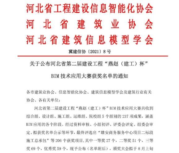 据悉,本次大赛由河北省工程建设信息智能化协会、河北省建筑业协会、河北省建筑信息模型学会共同举办,共收到237项参赛成果,最终评选出一等奖27个,二等奖51个,三等奖69个,优秀奖59个。此次获奖,充分展现了公司BIM技术应用水平和实力,彰显了企业品牌形象。(BIM中心