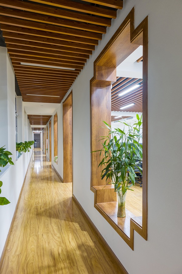 由于办公区裸露门洞窗洞较多,极具艺术感,于是在设计风格方面设计师借鉴了中式古典花窗元素,将四个窗洞设计为不同造型,曲直转折均一丝不苟,淋漓尽致地展现出中式古典花窗的特点,使得简洁的空间多了一丝东方韵味。这样舒适雅致的办公环境更能激发设计师的创作灵感,让设计师创作出更好的设计河北四建。